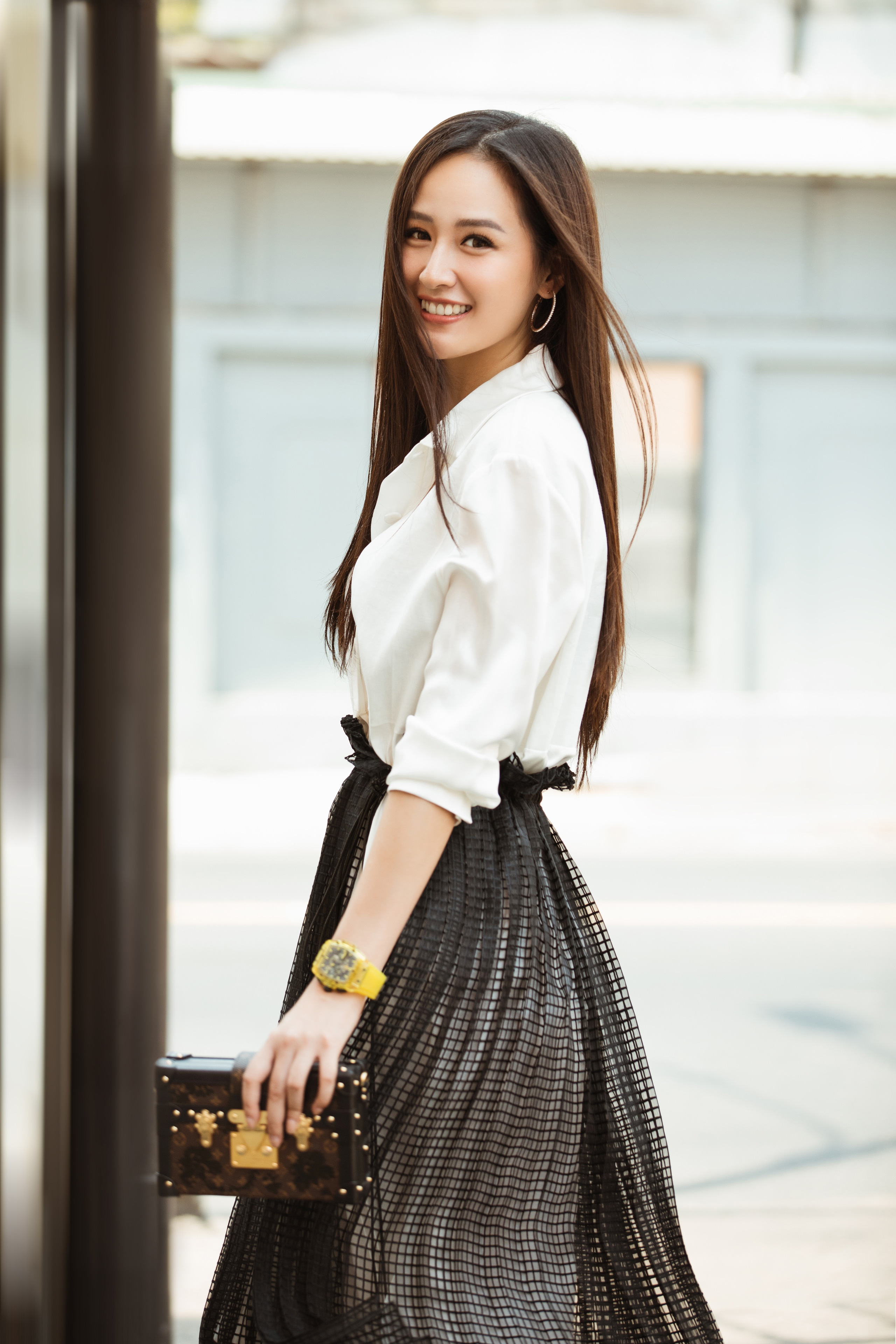 Người đẹp ngày càng lên tay trong cách mix đồ, chiếc áo sơ mi đơn giản được Mai Phương Thúy diện phác cách khi mix cùng chân váy buộc dây và giày thể thao. Phụ kiện mà cô lựa chọn là chiếc túi Louis Vuitton thuộc dòng Petite Malle có giá khoảng 130 triệu VNĐ và đôi Louis Vuitton Archlight có giá khoảng 25 triệu VNĐ - đây cũng là đôi giày gây sốt một thời gian và được nhiều sao Việt lựa chọn.